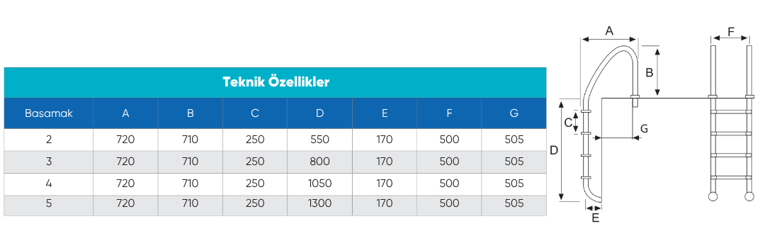 Ø43 mm paslanmaz çelik borudan üretilmiş, kaymaz basamaklı ve 51 cm genişliğe sahip 3 basamaklı standart havuz merdivenidir. Rozetleri ve montaj parçalarıyla birlikte güvenli, dayanıklı ve uzun ömürlü kullanım sağlar.